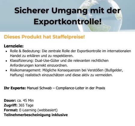 Dieses Microlearning vermittelt Ihnen die wichtigsten Grundlagen der Exportkontrolle in kurzer, praxisnaher Form. Sie erfahren, welche Vorschriften relevant sind, welche Abteilungen eingebunden werden müssen und wie Sie typische Fehler vermeiden können.
