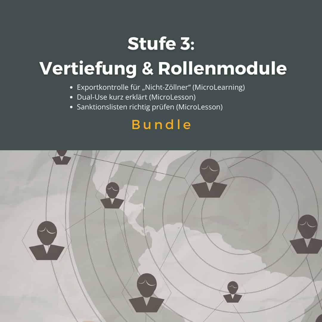Der Lernpfad „Stufe 3: Vertiefung & Rollenmodule“ richtet sich an Mitarbeitende mit konkreter Verantwortung in einzelnen Prüfschritten der Exportkontrolle oder mit besonderer Schnittstellenfunktion im Unternehmen.